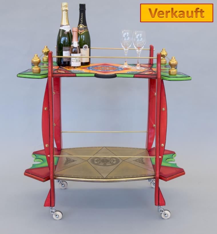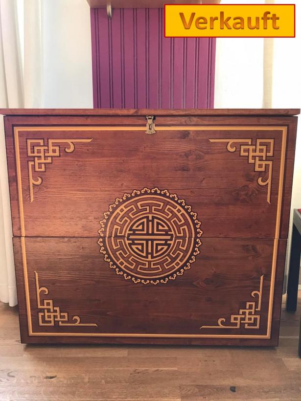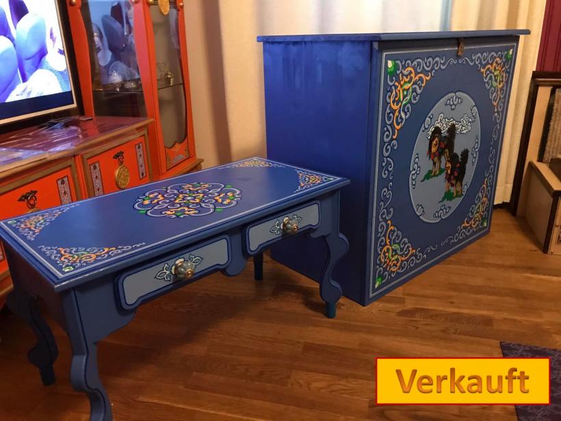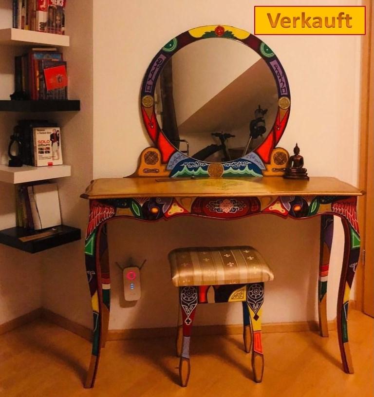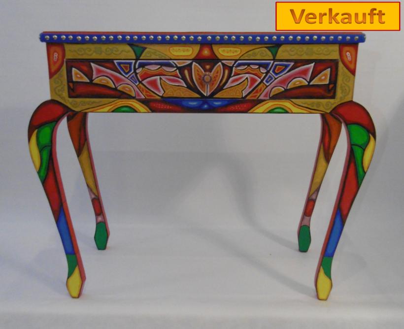 Aber MMM möchte nicht nur benutzen sondern darüber sich freuen zu betrachten. Meine Möbelstücke sind einzeln angefertigt aus Naturholz mit intensiven Farben und Designs,traditionale Ornamenten manchmal Kunstvoll mit verschiedenen Motiven bemalt.